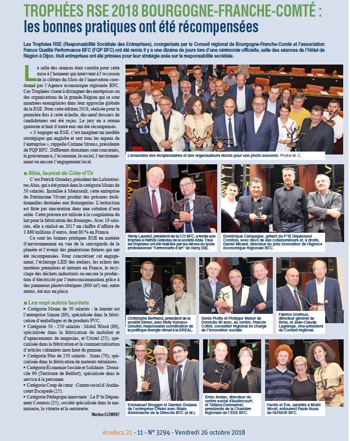 FQP BFC a organisé pour le compte de la Région, une nouvelle édition des Trophées de la Responsabilité Sociétale des entreprises (RSE). La cérémonie de remise des Trophées RSE s’est déroulée le 15 octobre 2018 au Conseil Régional Bourgogne Franche Comté